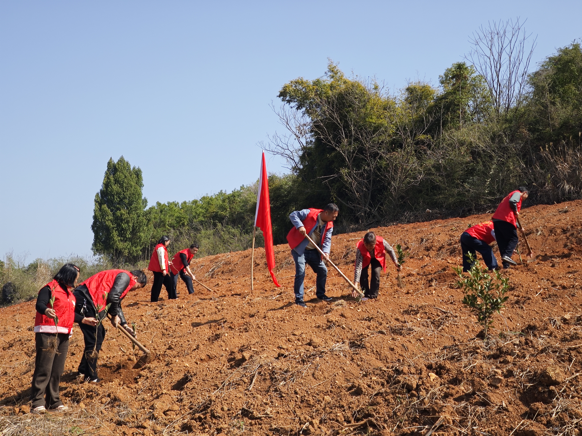 当天下午,植树现场党旗迎风招展,一派热火朝天的劳动景象。身着红马甲的志愿者们三五成组,分工协作,配合默契。挥锹铲土、扶苗填坑、踏土夯苗、提水浇灌……每一个环节都一丝不苟,现场井然有序。在众人的辛勤劳作下,原本空旷的荒坡上,312株新栽种的果木树苗迎风挺立,错落有致,在明媚的春光中焕发出勃勃生机。此次植树活动共计完成绿化面积7亩,让昔日的荒坡地披上了崭新的绿装。