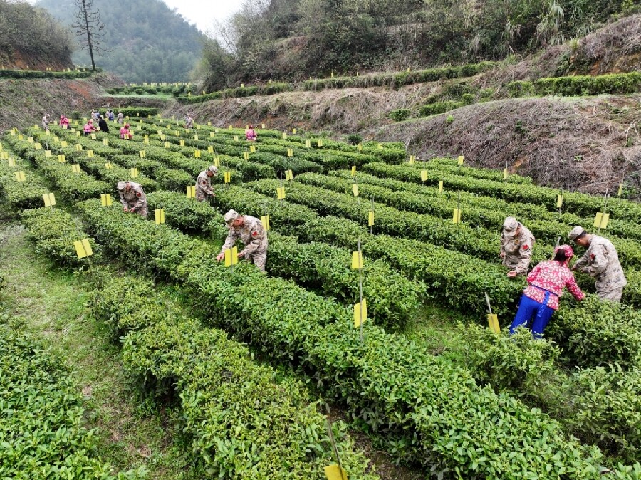 3月27日,春回大地,雾茶飘香。随着气温回暖,桥市乡的茶园迎来明前茶集中采摘期。当地人武部出动“助农服务队”,帮助茶农抢采“明前茶”,茶香溢满振兴路。