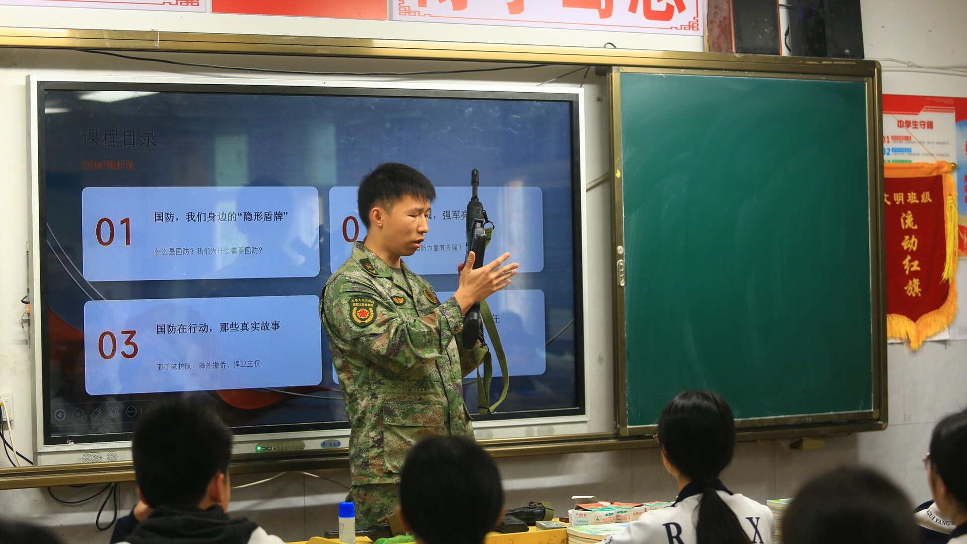 课堂上,民兵还准备了95式突击步枪模型,介绍相关枪支弹药的组装部件和操作方法,在寓教于乐氛围中进一步提升青少年的国家安全意识。