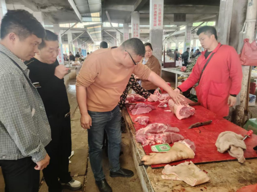 今天是赶圩日,市场人声鼎沸。由镇党委牵头,副镇长与执法大队队长、畜牧站站长、应急专干等一行人组成联合检查组,对和平圩场肉类和野生菌销售摊位开展例行巡查。