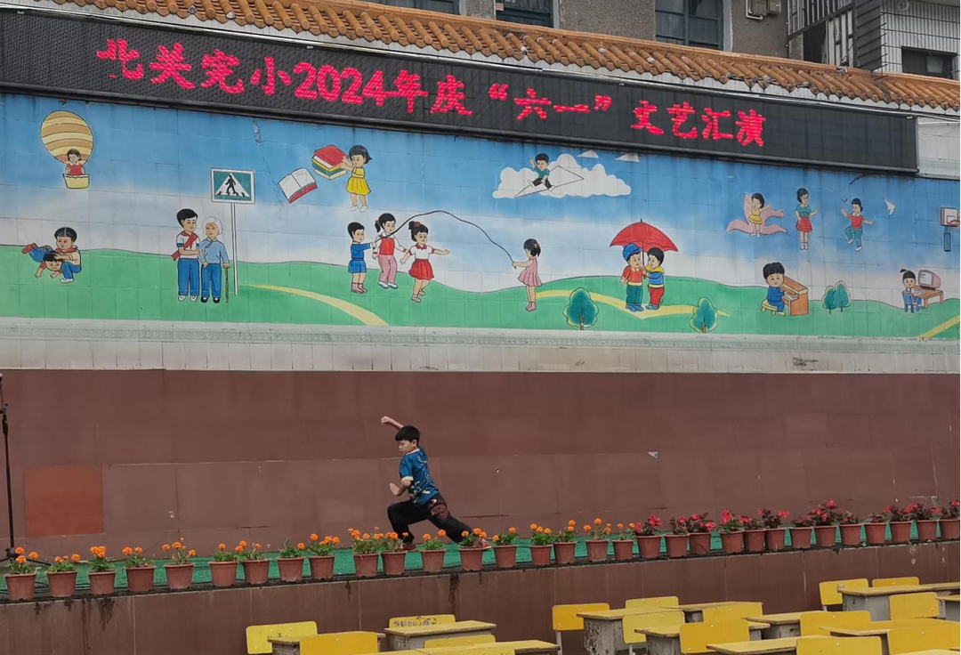 紧接着,精彩的文艺演出拉开了活动序幕,歌曲、舞蹈、小品、朗诵、课桌操、武术表演等好戏连台。本次活动共安排了14个文艺节目:一、二年级集体舞《勇气大爆发》、《向快乐出发》尽显孩子们的童真童趣;三、四年级朗诵《历史的遗憾》、《读中国》进一步激发了孩子们对祖国的热爱;五年级武术表演洋溢着青春活力,坚定有力的步伐,威武帅气的动作,一招一式、衣角翻飞间尽展少年人的侠义风骨;六年级课桌操《像你这样的朋友》、《把未来点亮》、《红星耀中国》祖国有我、《Yes! OK!》展现出新时代青少年的阳光活力,整场活动在《小美满》的欢乐曲声中圆满落下帷幕。