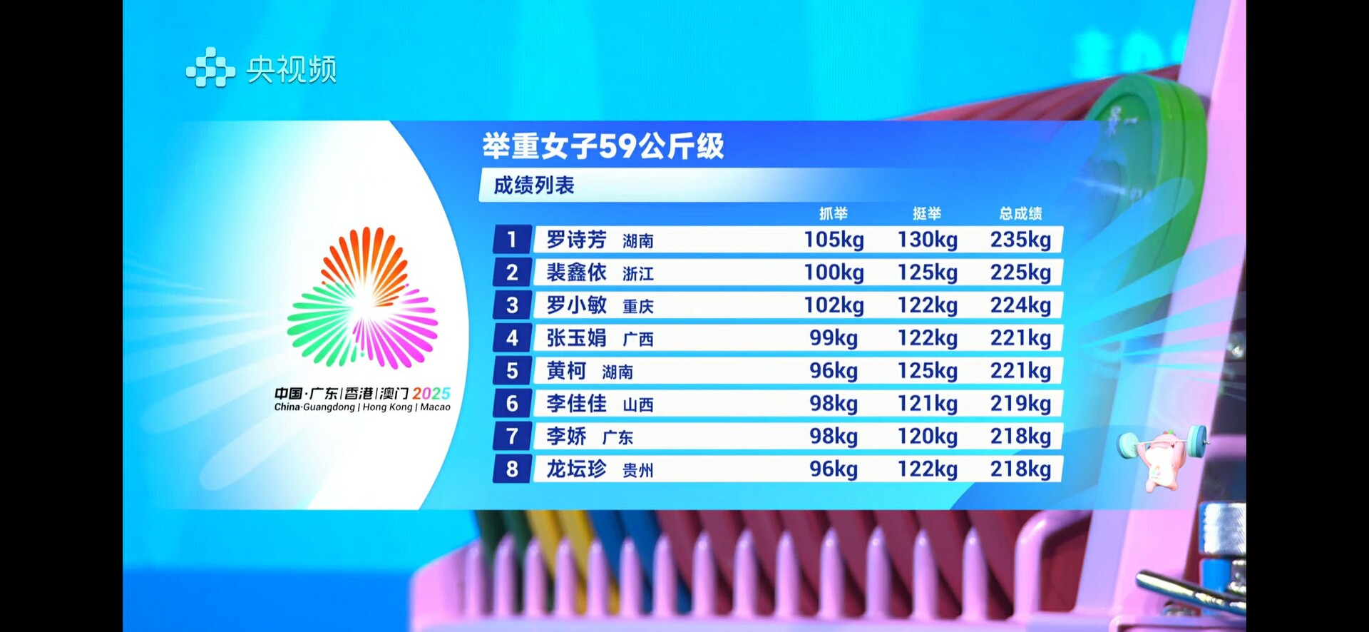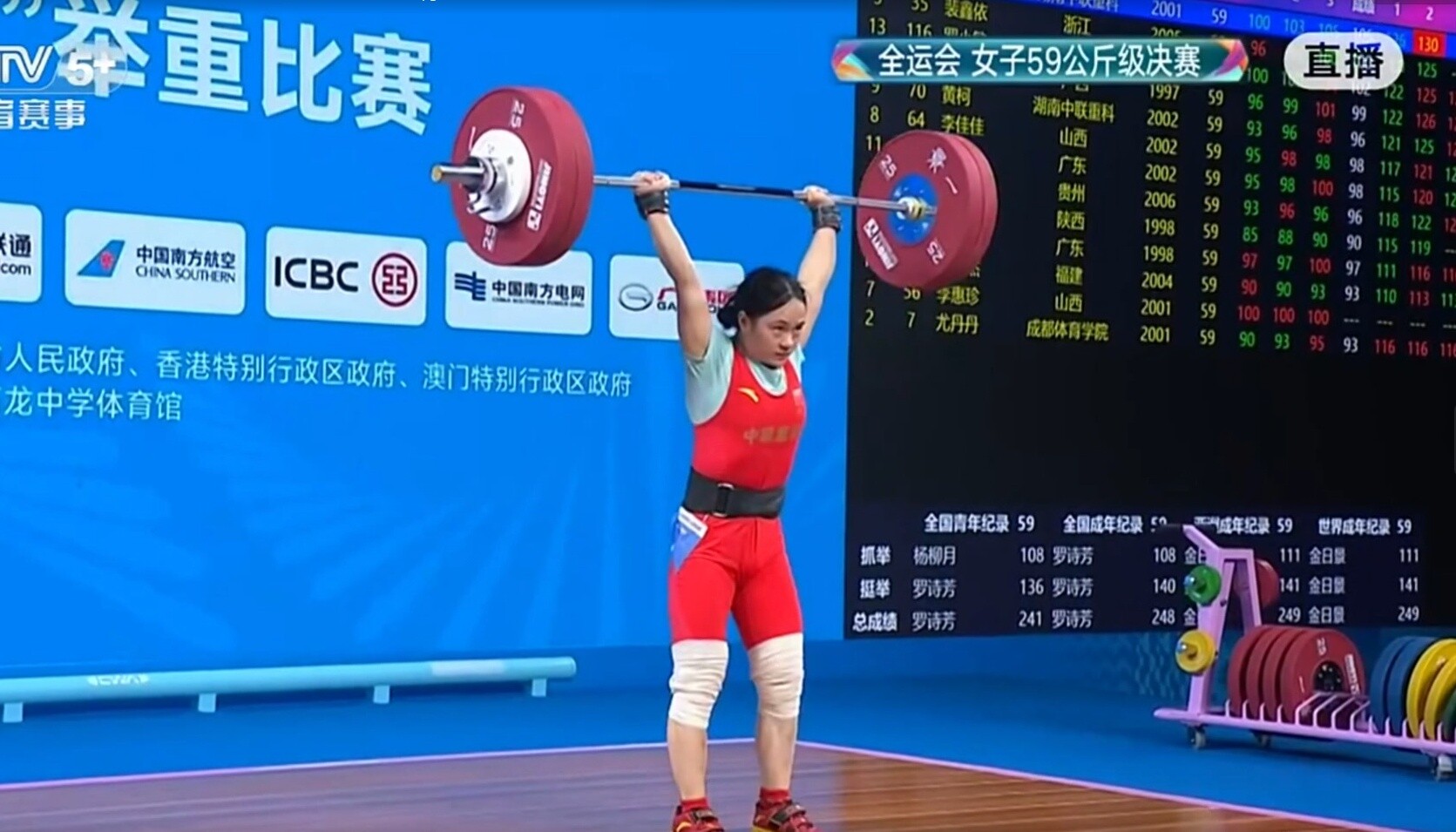11月11日晚,第十五届全运会女子59公斤级举重决赛在广东举行。巴黎奥运会冠军、陕西全运会冠军、桂阳籍运动员罗诗芳以5次试举“零失误”,抓举105公斤、挺举130公斤、总成绩235公斤的成绩摘得桂冠,成功卫冕该项目冠军。