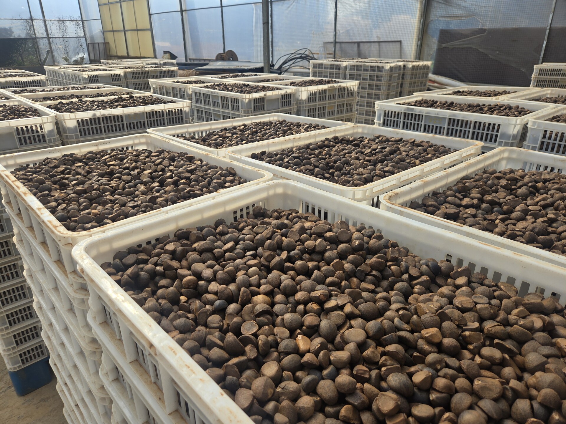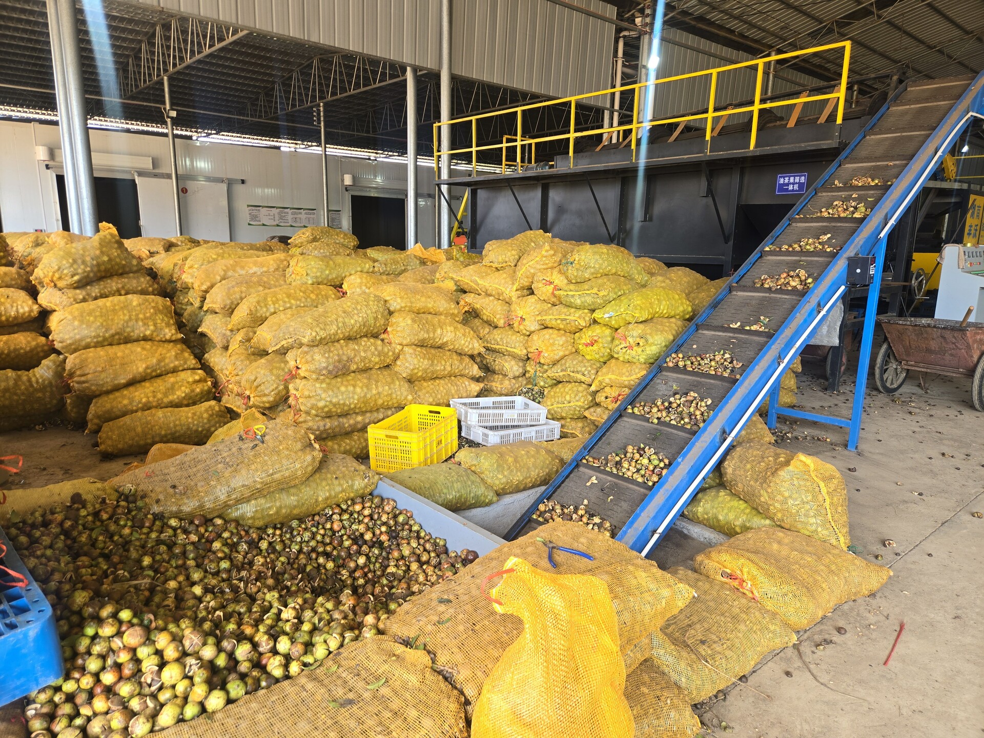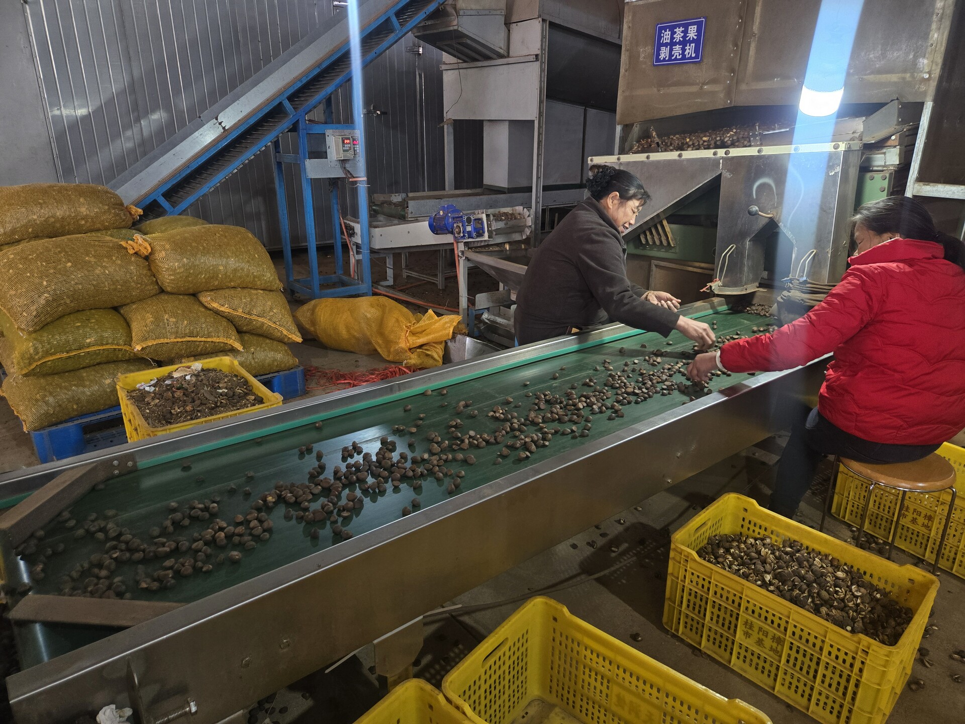 走进樟市镇山河村油茶加工生产基地,一袋袋鲜茶果整齐码放在储货区。在这里,一颗油茶果将经过分拣、剥壳、清洗、筛选、初烤等工序,全程仅需45分钟,色泽金黄、水分含量30%干茶籽就可以装框了。初制后的茶籽再转入烘烤房进行集中烘烤,最终将含水量精准控制在9%左右,成为每5斤可炼1斤油的优质干茶籽。