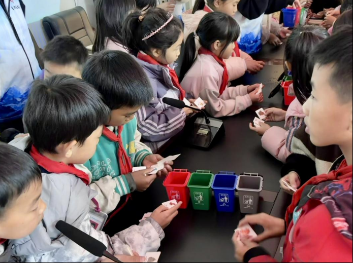 在“长江小卫士特工队”成立仪式上,同学们化身守护江河的“小特工”,环保知识与垃圾分类技能则成为他们的“核心任务”。为强化学习效果,宣讲团精心设计垃圾分类趣味挑战赛:印有塑料瓶、果皮、废电池等图案的卡片被分发给同学们,大家需在规定时间内将卡片投入对应分类垃圾桶。现场同学踊跃举手、争相参与,在欢声笑语中精准掌握了垃圾分类的基本方法。宣讲团还为同学们送上桂阳县垃圾分类宣传手册,鼓励大家成为环保“传声筒”,将绿色理念传递到校园每个角落、每个家庭。