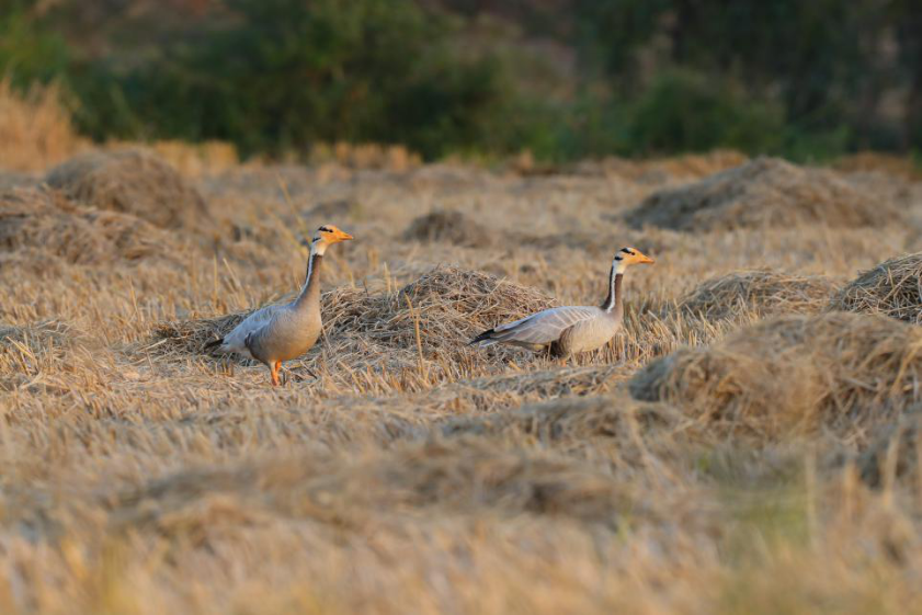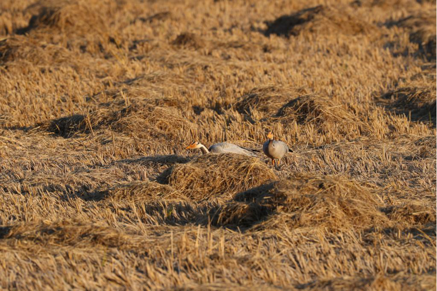 在舂陵国家湿地公园洋市段江边稻田,这两只斑头雁正悠然啄食禾苗根茎,姿态优雅。其独特的形态特征——头部洁白,头顶至后颈点缀两道清晰的黑色横斑,橙黄色的喙和脚在阳光下格外醒目,让工作人员一眼就确认了这一珍稀物种的身份。