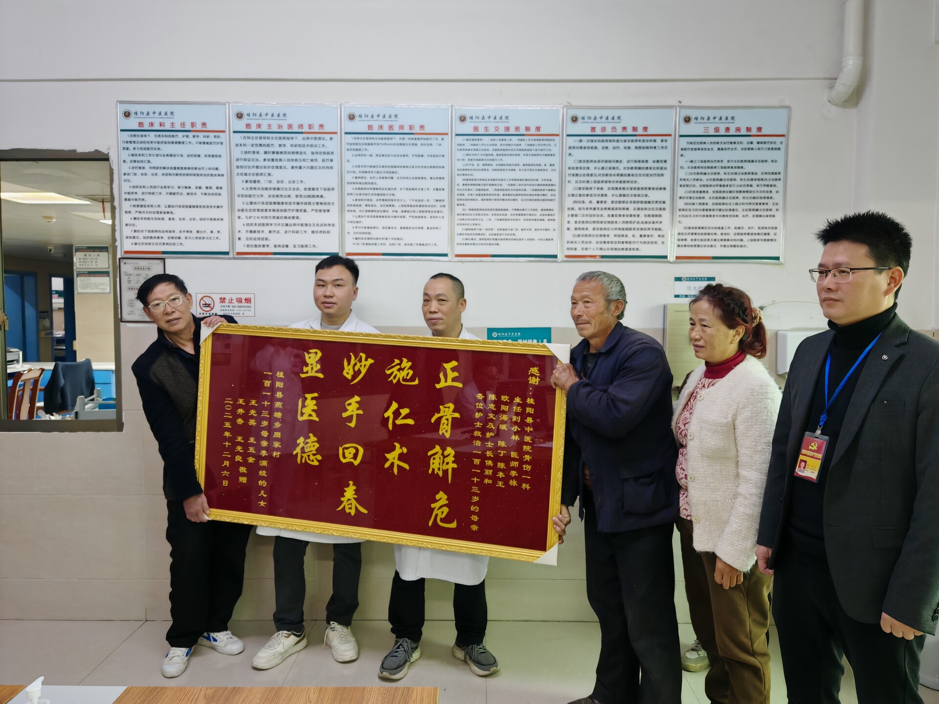 12月5日,病人家属把印有“正骨解危施仁术 妙手回春显医德”的牌匾送到县中医医院骨伤一科感谢医生为他们的百岁母亲治愈病痛,让老人能够重新站立行走。